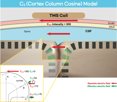 DEEP TMS™의 형성하는 심부의 전자기장은 Cortical Column에 평행을 이루며 Sulcus 영역에 존재하는 대량의 뉴런을 활성화시키는데 효과적입니다. 2